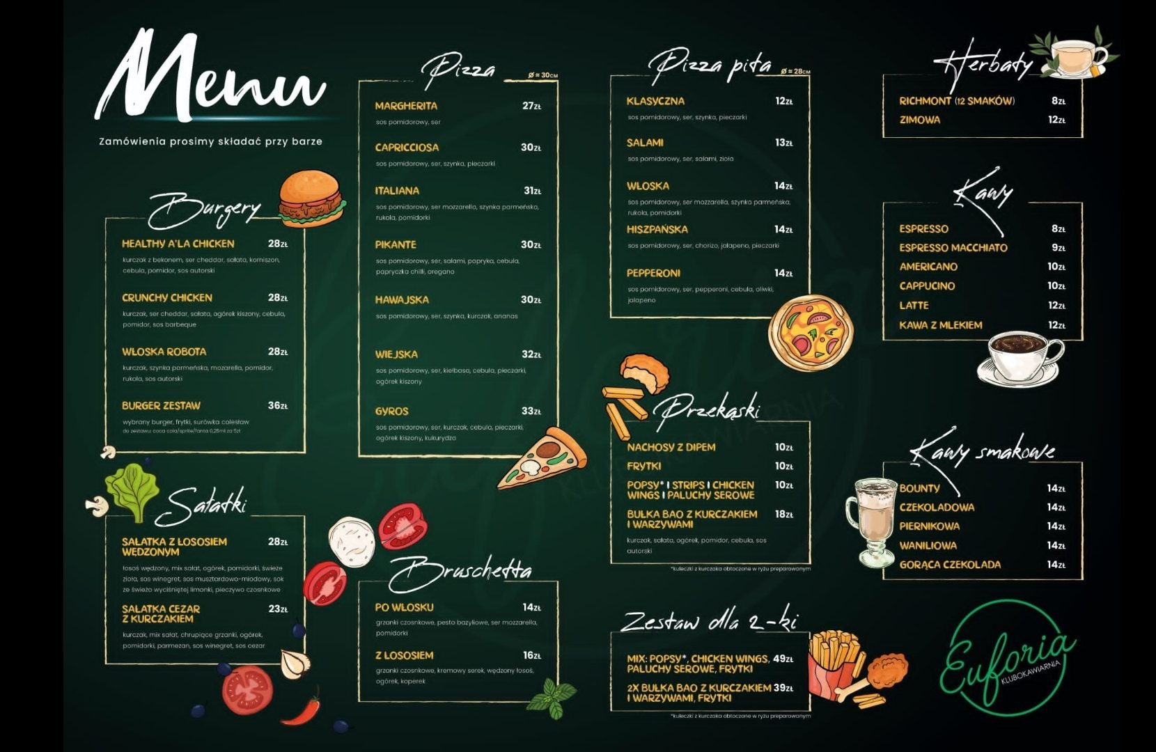 Nasze menu jest różnorodne i z pewnością pomoże w wyborze idealnych dań. W Eufori panuje świetna atmosfera, a od piątku do soboty nasi dj sprawiają, że parkiet zapełnia się tańczącymi gośćmi. Skorzystaj z naszej oferty specjalnej i przekonaj się, dlaczego nasz lokal jest niezwykle wyjątkowy!